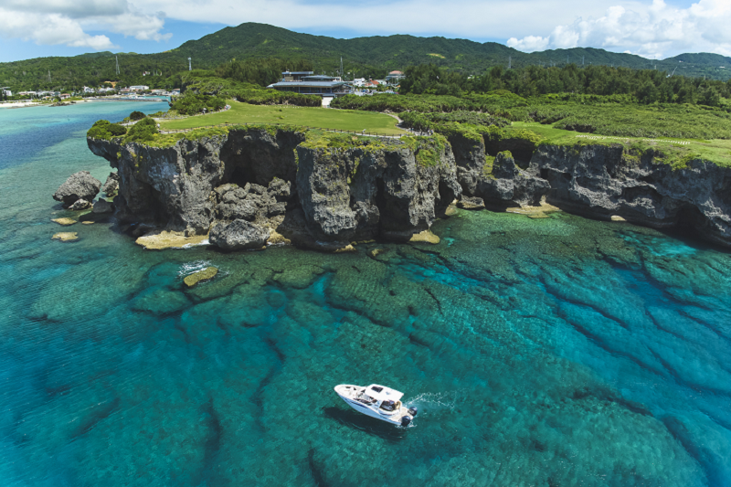 Manzamo, praised by the Ryukyu King as “a field where ten thousand people can sit,” offers a breathtaking view worthy of its name. From the cruise ship, you can enjoy the vast expanse of the East China Sea with it myriad shades of blue, the towering cliffs among Okinawa’s raised coral reefs, and the terraces and sea cliffs of Ryukyu limestone.