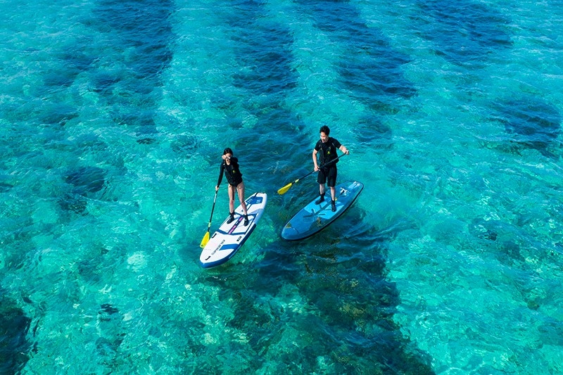 安定感抜群のクリアサップ。海の状況次第で、初めての方でもすぐに立って漕ぐことができます。船体のほとんどが透明なので、まるで水面を歩いているかのような感覚を生み出します。うつ伏せになって水中の美しい世界をじっくりと観察したり、仰向けになって青い空を眺めたり、多彩なスタイルで思い出に残るひと時をお楽しみください。