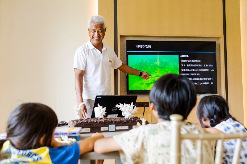 Guests of the hotel are invited to participate in this 60-minute program, which includes a series of hands-on activities for both children and adults and takes place every Tuesday and Friday morning. The experience begins with an introduction on the rich connections of coral reefs and other creatures and proper marine environment conservation. The program is funded by the profits generated from sales of Halekulani Okinawa's eco-bags, which are made from recycled PET (plastic) bottles and sold at the hotel's on-property boutique.