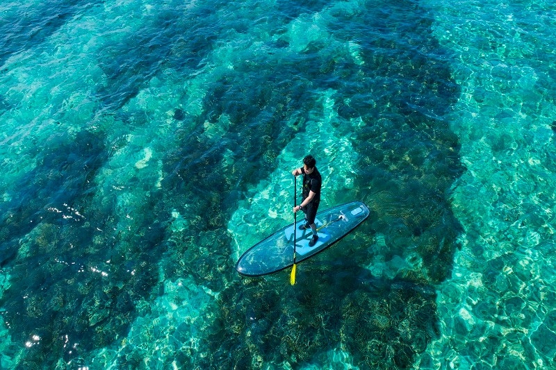With its outstanding stability, the clear SUP allows even beginners to quickly stand up and paddle on days when the sea is calm. As the majority of the hull is transparent, a unique sensation of walking on the water’s surface can be experienced. Enjoy various activities such as lying on your stomach and observing the underwater world or lying on your back and admiring the blue sky.