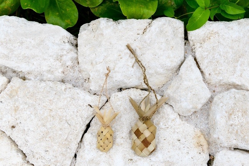 In Okinawa, there is a tradition of carrying a bag filled with ma-su (salt) as a talisman or protective charm. Join us and enjoy making your own good luck charm bag using adan leaves used for traditional folk tools.
