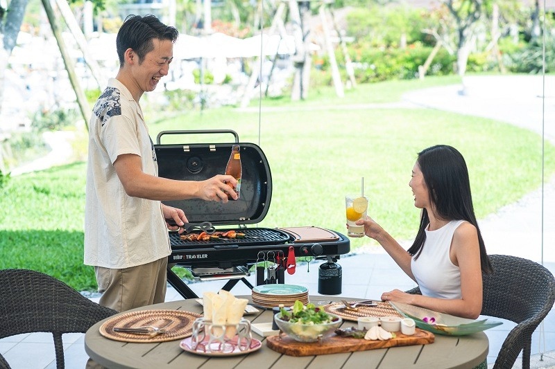 ハレクラニ沖縄のビーチフロントウイング2階に位置する”BBQエリア“では、開放的なオープンエアのテラスで、ゲスト自身で焼き上げるBBQプランをご用意しております。