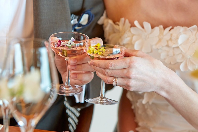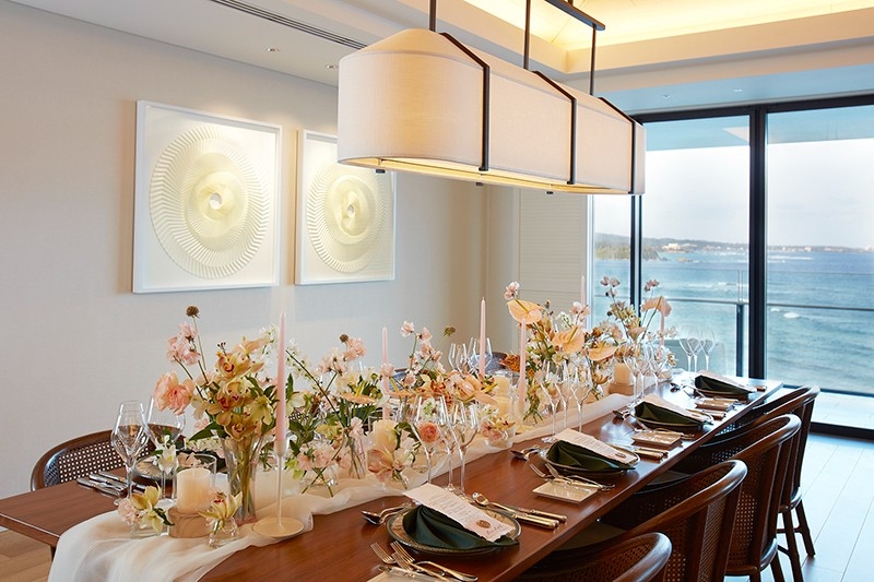 サンセットウイング最上階に位置するラグジュアリーな空間で、青く輝く海とゆったりと流れる雲を眺望に、厳かに流れるヴァイオリンやチェロなどが奏でる弦楽器の音色、そしてシェフやソムリエたちが創り出すオーダーメイドのお食事やドリンクのペアリングが、祝福の日を演出します。