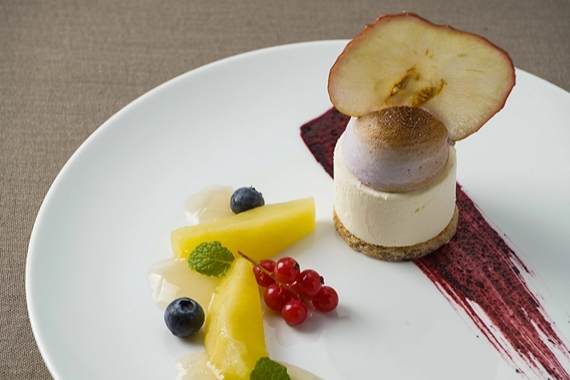 ブルーベリーとフロマージュブランのスフレグラス 林檎のコンポート添え