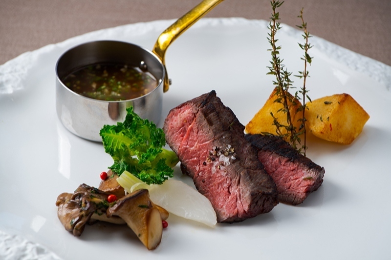 塩麹でマリネした牛ハラミのステーキ もろみ酢とゴーヤーのソース 森のキノコとローストポテト添え