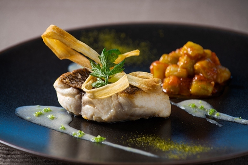 沖縄産マーマチのポワレ ナーベーラーのラタトゥイユ アーサ海苔の潮ソース