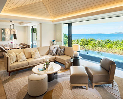 ビーチフロントウイングの最上階に位置するオーシャンテラススイートは、ダイナミックな滞在空間。リビングルームの2面・240cmのワイドウィンドウから清爽なパノラマビューをお楽しみください。