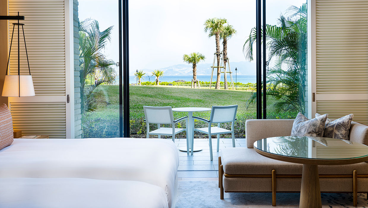 ビーチフロントウイングの地上階に位置し、テラスから芝生のグリーンと、沖縄本島の中で最も美しいといわれる名護湾を眺めながら、ゆったりと流れる"琉球"の時の移ろいとともに、上質なご滞在をお楽しみください。