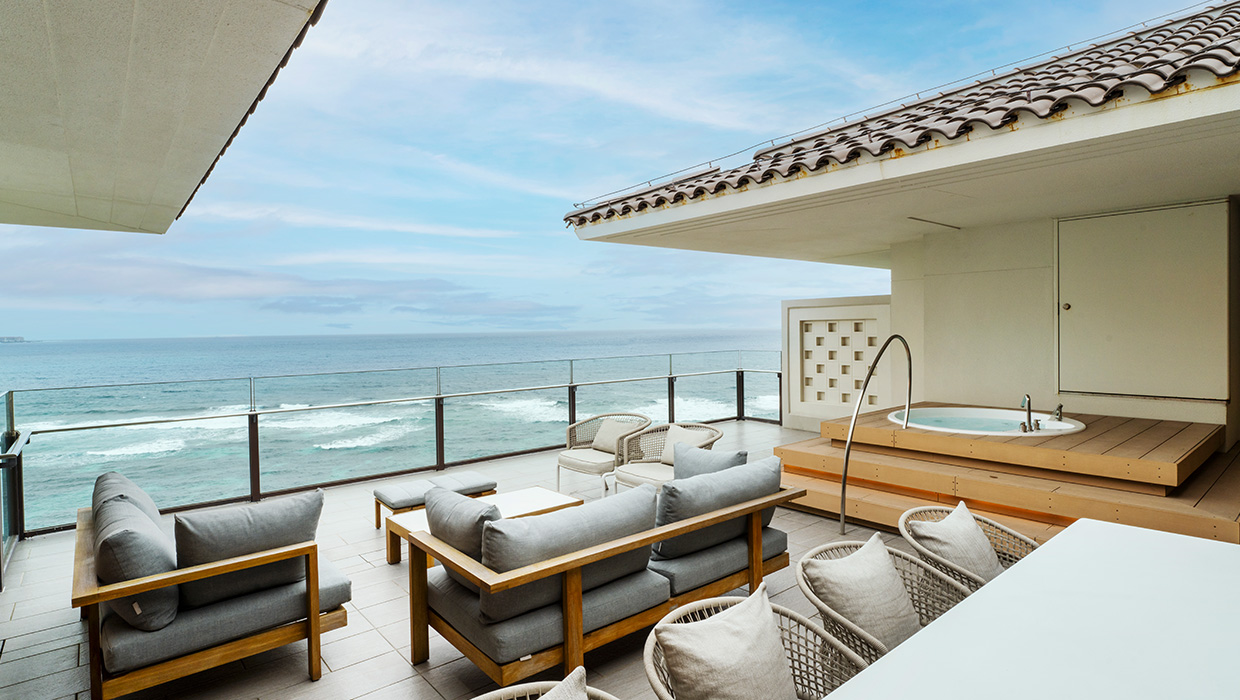 ビーチフロントウイングの最上階に位置するオーシャンテラススイートは、ダイナミックな滞在空間。