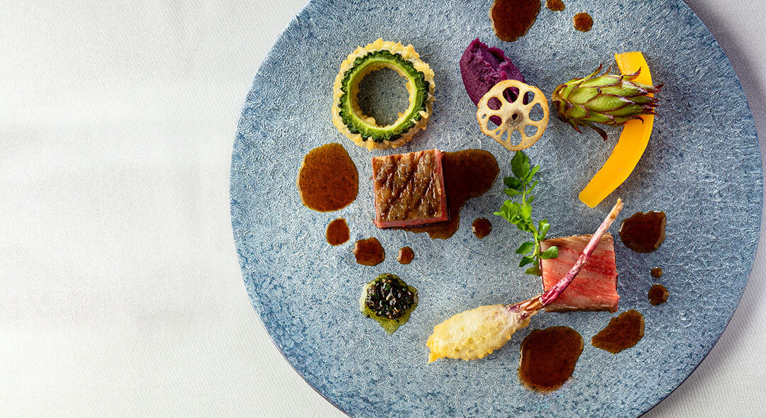 ハレクラニが誕生したハワイと沖縄。2つの言語で愛にちなんだ花言葉をテーマに、フレンチベースの特別コースをご用意しました。より特別なお料理をご希望のおふたりには、シェフとつくるフルオーダーメイドのオリジナルコースも。ここでしか味わうことのできない一皿を、おふたりに代わって丁寧に仕上げます。