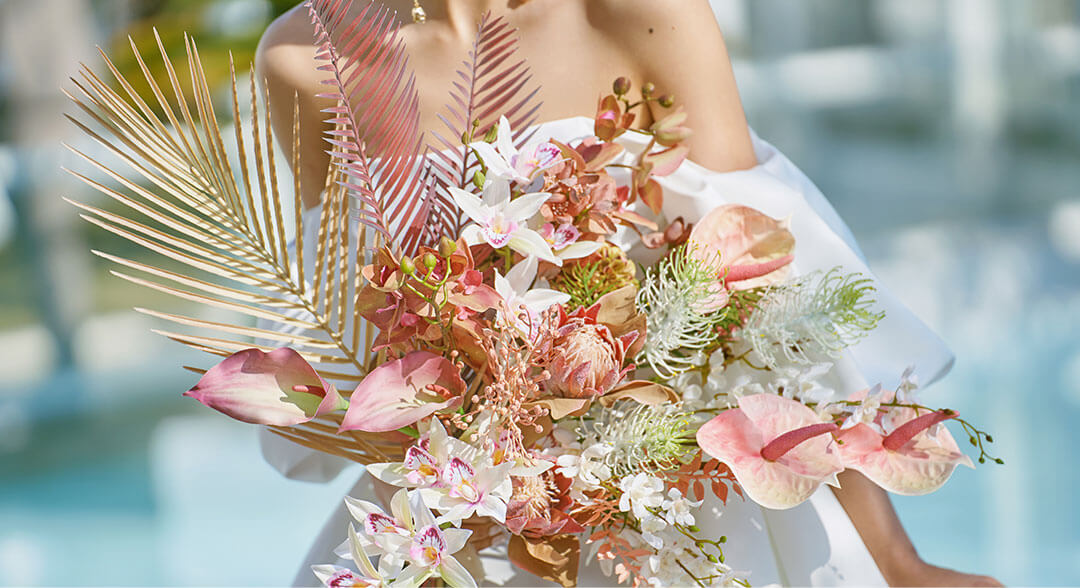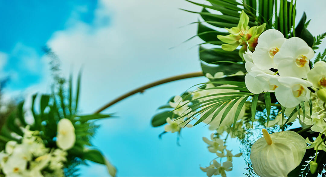 沖縄ならではの花にも詳しいフラワーコーディネーターが、おふたりの結婚式を華やかに彩ります。ブーケとブートニア、セレモニーの大掛かりな装花、お食事のひとときを演出するテーブルコーディネートのお花。フラワーアレンジメントでおふたりらしい世界観を表現いたします。