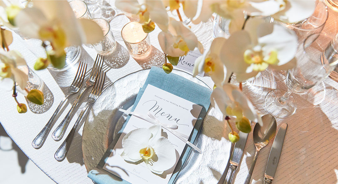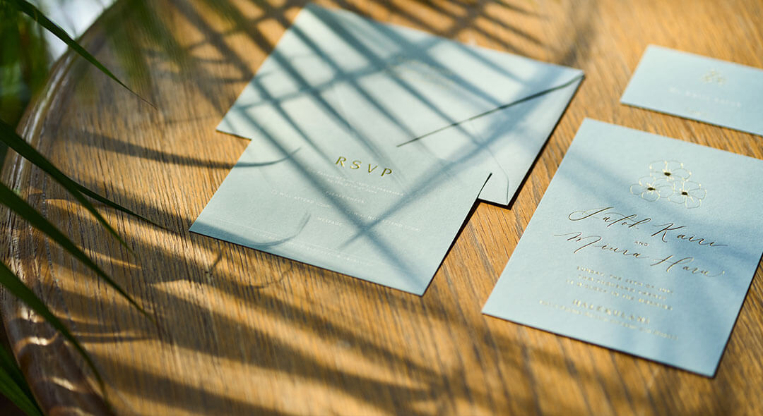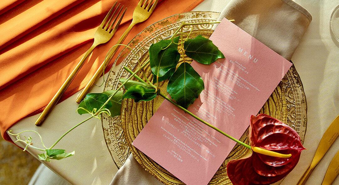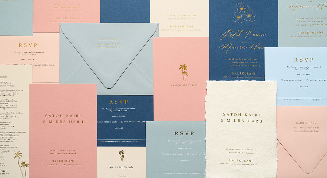 ハレクラニ沖縄のオリジナルペーパーアイテムをご用意しております。おもてなしの心が伝わるよう、デザインと質感にもこだわりました。招待状から当日のメニュー表まで、結婚式のコンセプトに合わせてお選びいただけます。いつまでも思い出に残しておきたくなるデザインです。