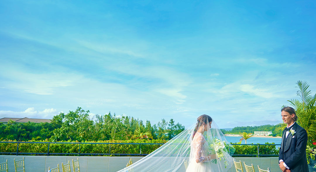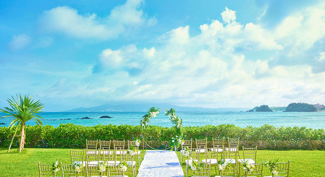 陽光の降り注ぐ広々とした芝生を、オーダーメイドの装花が彩ります。波の音に重なるように生演奏の音色が響くと、セレモニー開始の合図。心地よい沖縄の風がウエディングベールをなびかせて、新婦がゆっくりと入場します。豊かな自然に祝福されながら、生涯の記憶に残る誓いの言葉を。