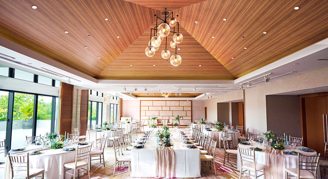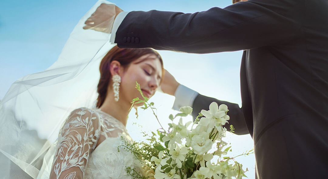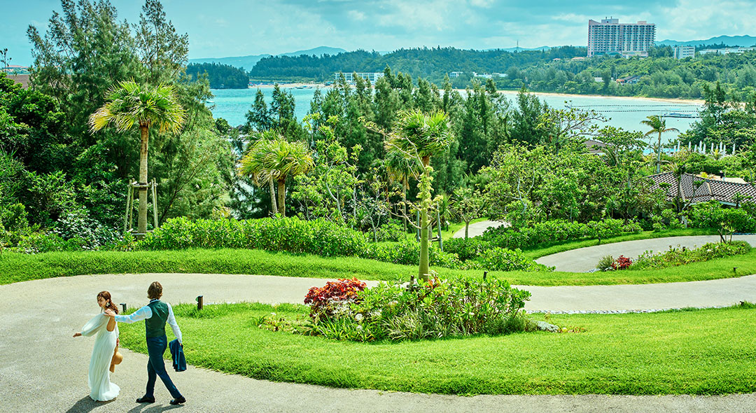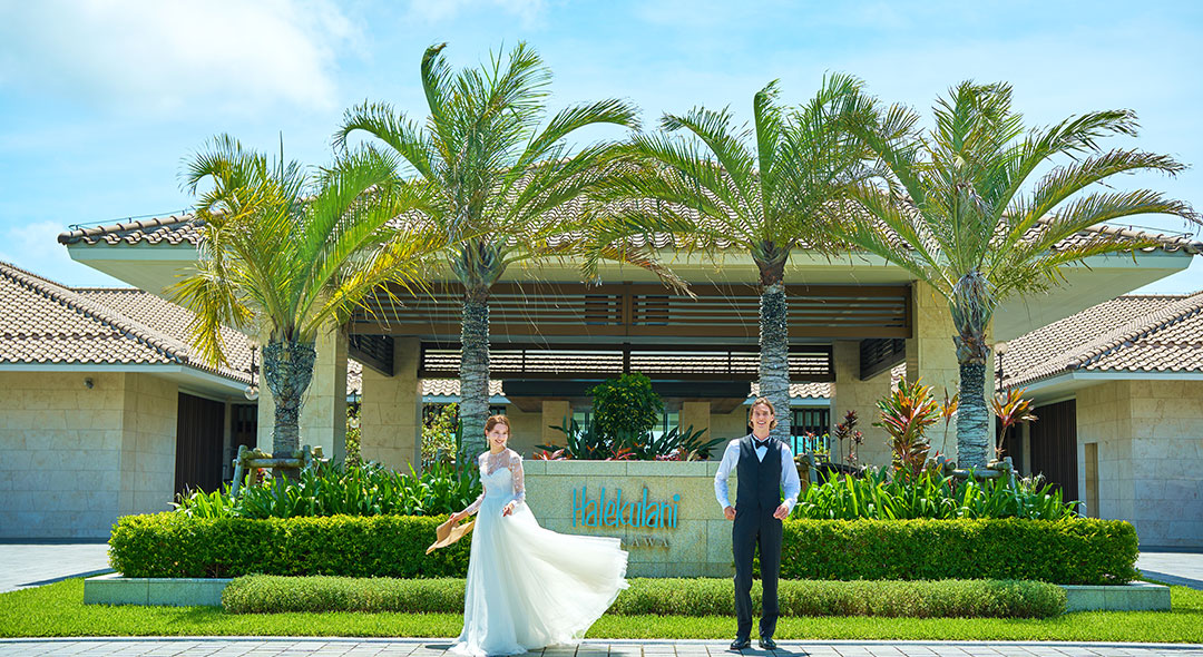 うるっとした瞳、少し照れた笑顔、ぎゅっと握り締めた手。結婚式のシーンをドラマチックに描くプロカメラマンが同行します。きっちりとした集合写真もお申し付けください。ハレクラニ沖縄の敷地内を散策しながら撮影するウエディングフォトもおすすめです。リゾートならではの自然体なおふたりを残しませんか?