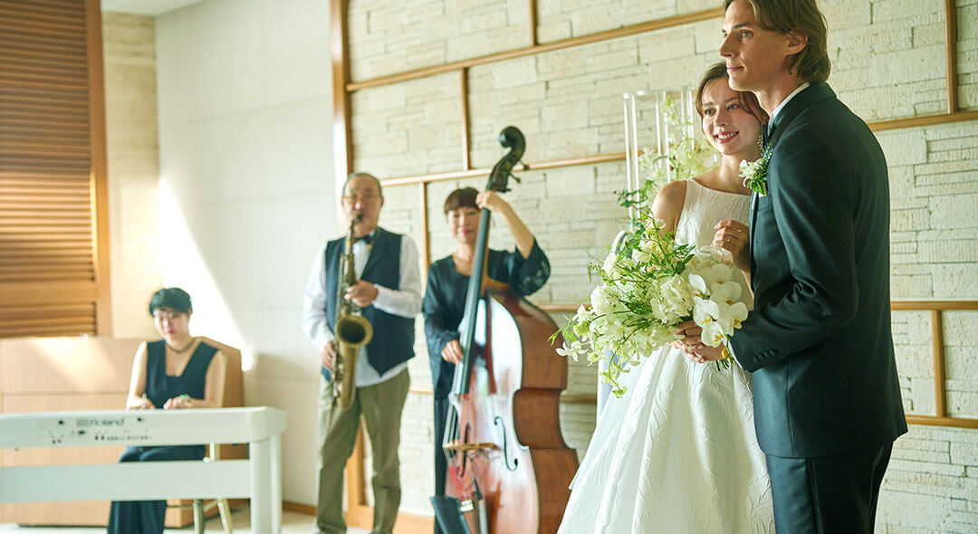 パーティ会場に接する屋外テラスまたは室内で、おふたりらしいセレモニーが叶います。列席の方にも移動の負担なくご参加いただきたい。そんなおもてなしにもぴったりです。大きな窓からたっぷりと日差しが入るハウテラスを貸し切り、よりプライベートなひとときに。